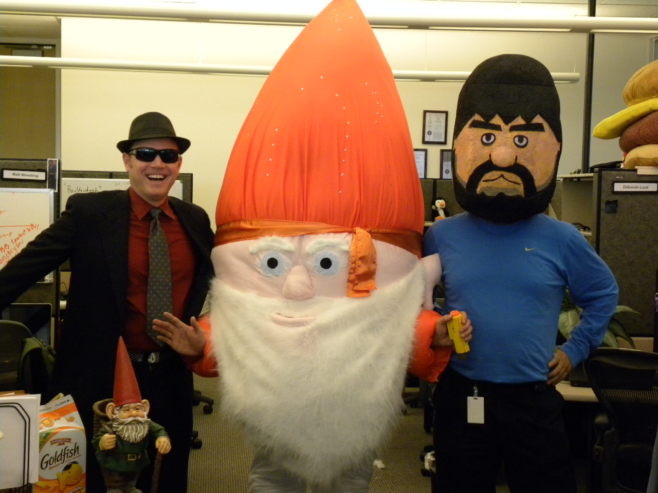 同僚も変な格好してきた。左はBlues Brothersかな?真ん中は妖精というのか、ドワーフというのか。右が自分。妖精の中に入っているのは以前にこのブログで紹介したこともある、Fortytwoクン。えらく気合が入っていた。