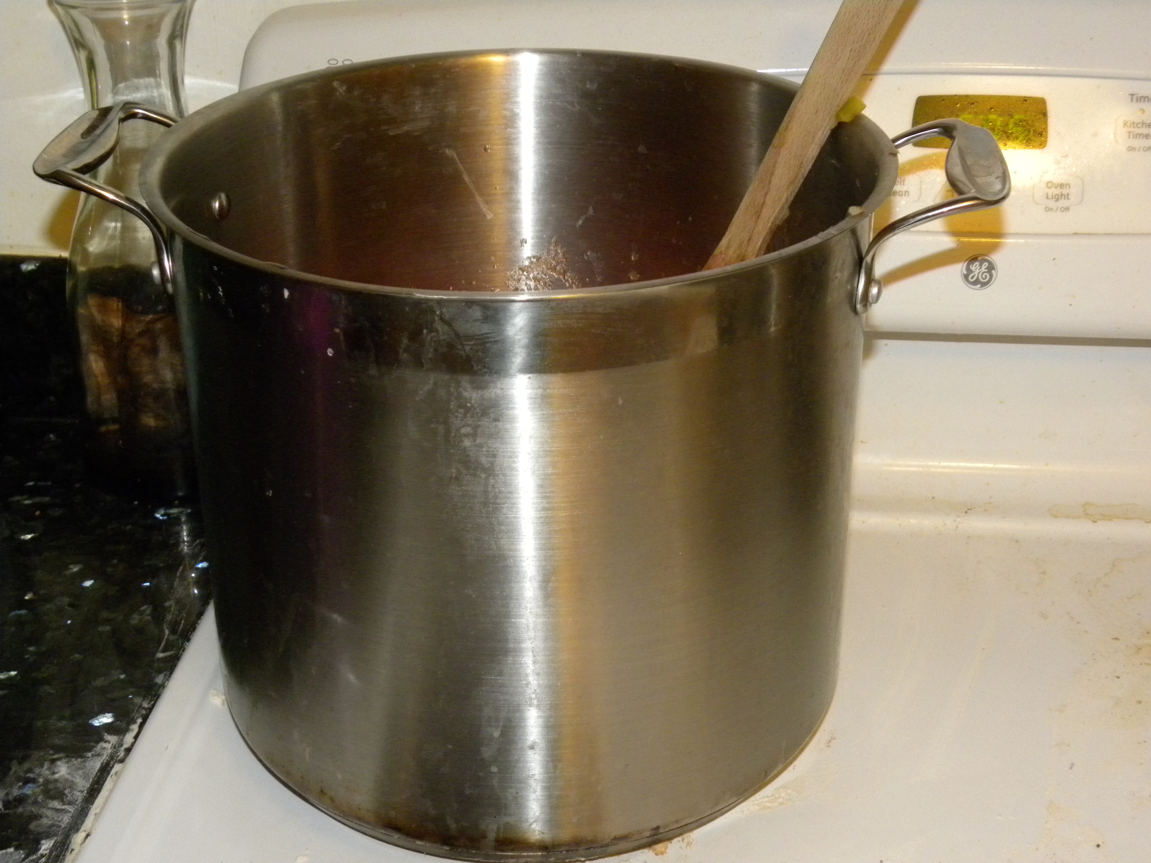 材料をすべてこのような鍋に入れて、全体がつかるくらいの水を加えて煮込んで行く。この鍋は高さも直径も30センチくらいある巨大なもの。チリ用に買ったようなもの。