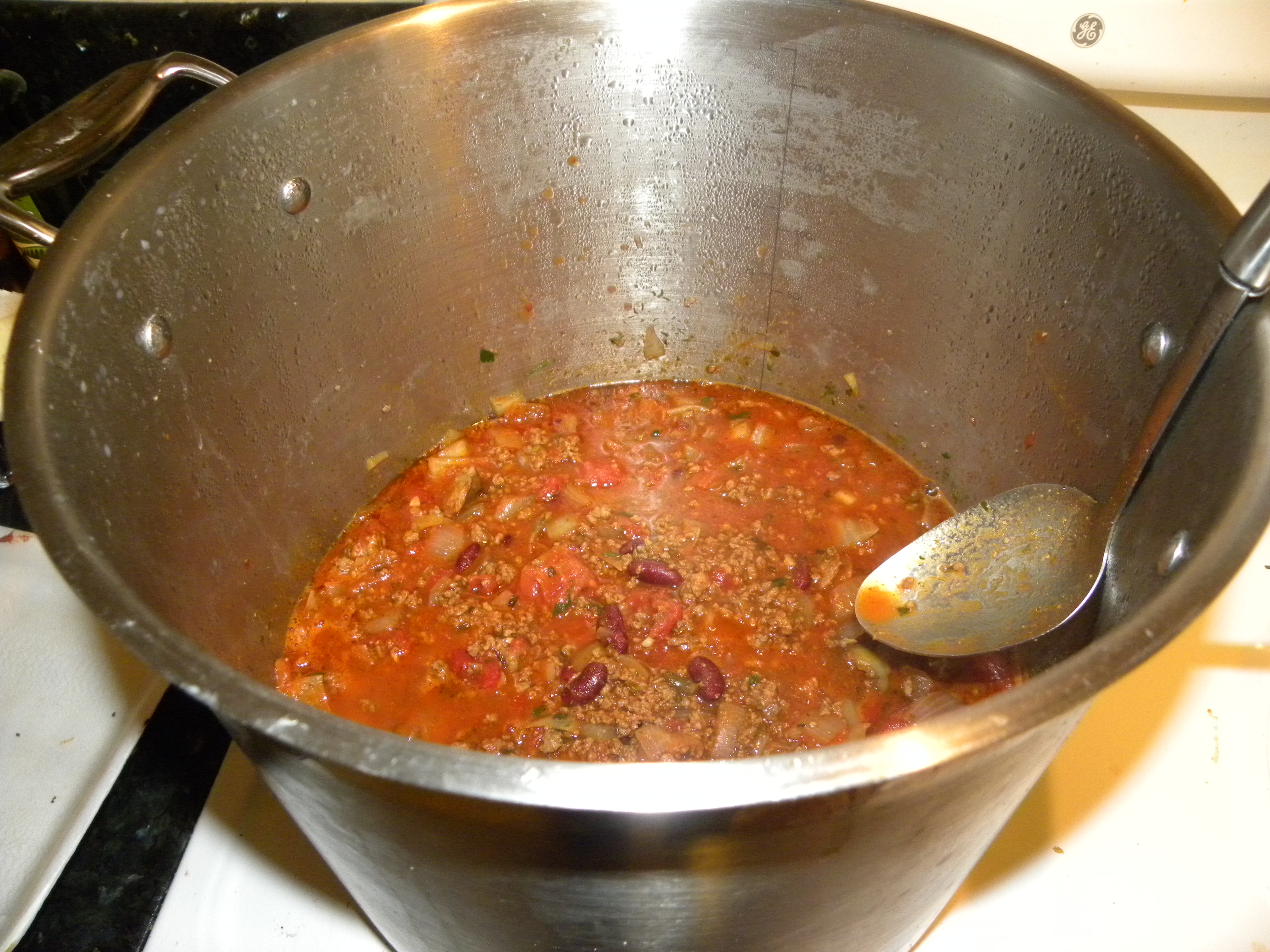 今回の特徴は上に書いたように、セロリとベルペッパーを入れない。代わりに玉ねぎが多く、水煮トマトは半分にカットした程度であまり細かく切っていない。さらにイタリアンソーセージが入る。挽肉が細かくなってしまうので、これらのおのが大きめの具になる。